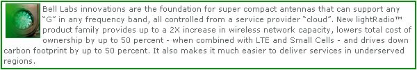 The partnership for C-RAN will use Alcatel-Lucent’s lightRadio, an innovation in mobile and broadband infrastructure for mobile networks. lightRadio, an architecture where the base station, typically located at the base of each mobile site tower, is broken into its components elements and distributed through the antenna or the network for cloud-like processing. Additionally the various mobile site tower antennas are combined and shrunk into a single, Bell Labs-pioneered multi frequency, multi standard (2G, 3G, LTE) device that can be mounted on poles, sides of buildings or anywhere else there is power and a broadband connection.