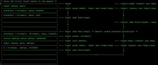 This post is originally written for a basic view on function call and stack frame in Intel x86 32-bit assembly code. EBP and ESP are the focus. A stack layout pic with dynamic register changes is also down there. May it help:)